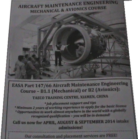 I came across an advertisement for EASA part 66 Aircraft Maintenance Engineering Course in China in a local newspaper in Malaysia. The Aircraft Licensing is one of the courses least understood by Malaysians, and this had led to a number of misunderstanding by the general public.